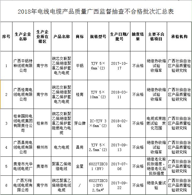 日前,廣西壯族自治區(qū)質(zhì)量技術(shù)監(jiān)督局在官網(wǎng)上發(fā)布通報,對包括化肥、塑料管件、電線電纜等在內(nèi)的8種產(chǎn)品的質(zhì)量監(jiān)督抽查情況進(jìn)行了通報。其中抽檢了43家企業(yè)生產(chǎn)的66批次電線電纜產(chǎn)品,其中6批次不合格,不合格產(chǎn)品檢出率為9.1%。